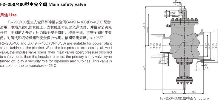 F2-250/400型主安全閥和沖量安全閥GA49H-16(DN40/50)配套適用于電站汽輪機的管線上。當(dāng)管線壓力超過允許值時,沖量安全閥先開啟,主閥隨之開啟;壓力降至安全值時,沖量關(guān)閉,主安全閥同步關(guān)閉,對管線和汽輪機起到安全保護作用。該閥適用溫度:≤425°C